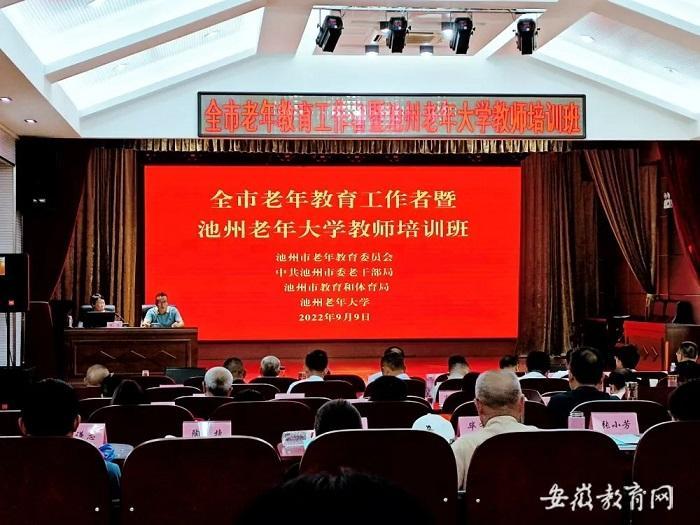 为进一步推动各级老年教育业务骨干能力建设,促进教师综合素质、专业化水平、创新能力和班级管理能力的全面提升,扎实推进全市老年教育工作高质量发展,9月9日,池州市老年教育工作者暨池州老年大学教师培训班举办。市委组织部副部长、老干部局局长、一级调研员、市老教委副主任李婷出席开班式并作动员讲话,会议由市教体局副局长、市老教办副主任许雪梅和池州老年大学常务副校长杨义和分别主持,各县(区)老教委常务副主任、办公室主任、老年大学校长、基层老年学校负责人代表、池州老年大学干部职工和部分教师代表近100人参加了培训,市委老干部局全体干部职工参加了《牢牢掌握意识形态工作领导权》专题培训。